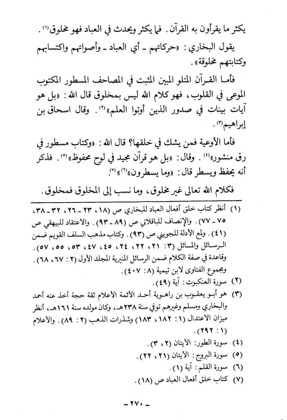 (¬١) انظر كتاب خلق أفعال العباد للبخاري ص (١٨، ٢٣ - ٢٦، ٣٢ - ٣٨، ٧٥ - ٧٧). والإنصاف للباقلاني ص (٨٩ - ٩٣). والاعتقاد للبيهقي ص (٤١). ولمع الأدلة للجويني ص (٩٣). وكتاب مذهب السلف القويم ضمن الرسائل والمسائل (٣: ٢١، ٢٢، ٢٤، ٤٥، ٤٧، ٥٣، ٥٥، ٥٧). وقاعدة في صفة الكلام ضمن الرسائل المنيرية المجلد الأول (٢: ٦٧، ٦٨). ومجموع الفتاوى لابن تيمية (٨: ٤٠٧).