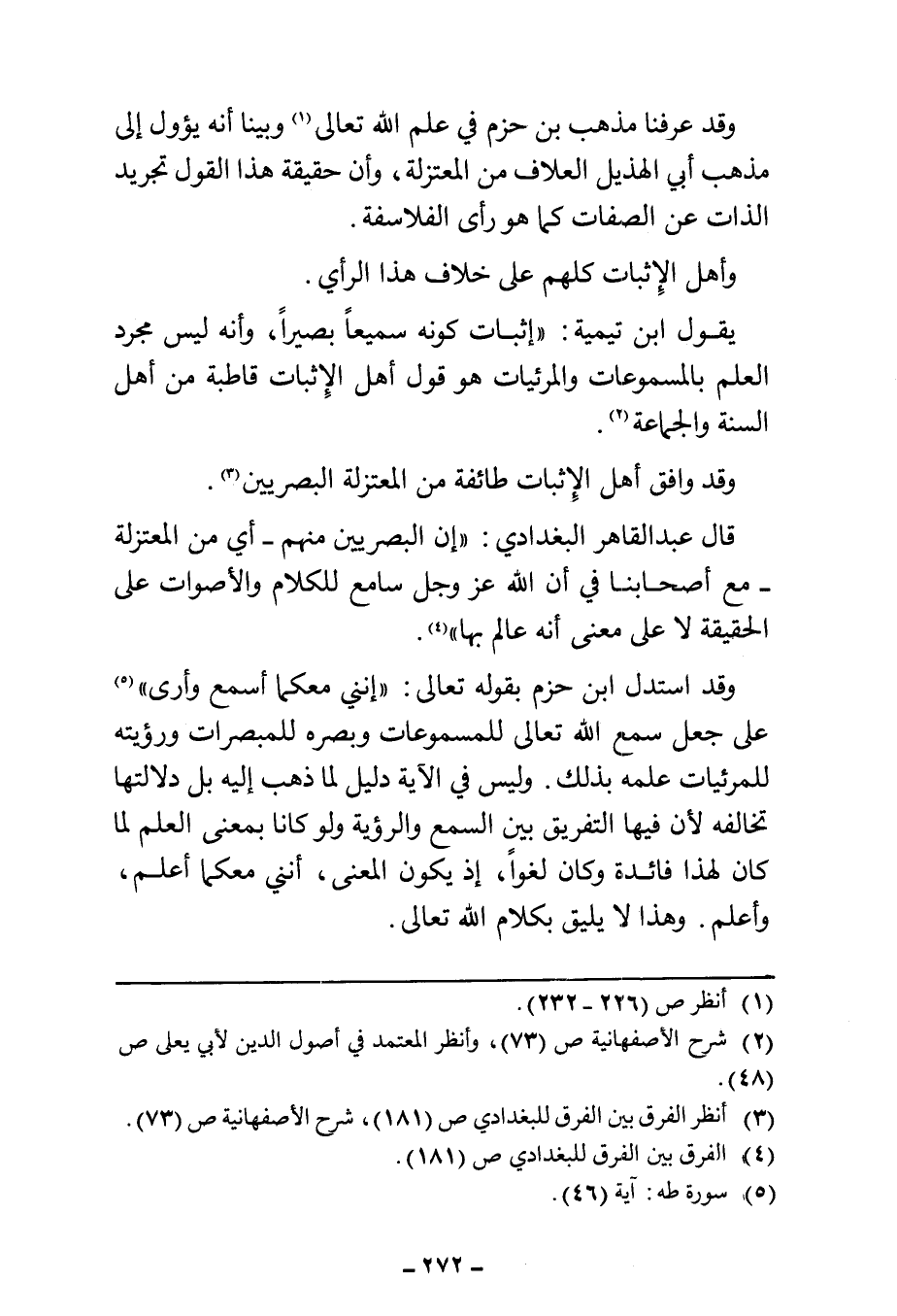 وقد استدل ابن حزم بقوله تعالى: {إِنَّنِي مَعَكُمَا أَسْمَعُ وَأَرَى} (¬٥) على جعل سمع الله تعالى للمسموعات وبصره للمبصرات ورؤيته للمرئيات علمه بذلك. وليس في الآية دليل لما ذهب إليه بل دلالتها تخالفه لأن فيها التفريق بين السمع والرؤية ولو كانا بمعنى العلم لما كان لهذا فائدة وكان لغوًا، إذ يكون المعنى، أنني معكما أعلم، وأعلم. وهذا لا يليق بكلام الله تعالى.