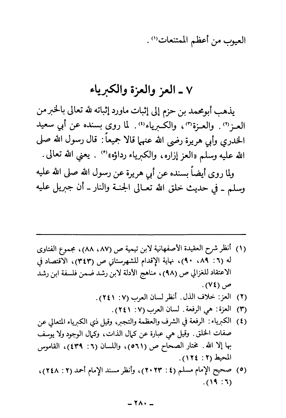 يذهب أبو محمد بن حزم إلى إثبات ما ورد إثباته لله تعالى بالخبر من العز (¬٢). والعزة (¬٣)، والكبرياء (¬٤). لما روى بسنده عن أبي سعيد الخدري وأبي هريرة رضي الله عنهما قالا جميعًا: قال رسول الله صلى الله عليه وسلم "العز إزاره، والكبرياء رداؤه" (¬٥). يعني الله تعالى.