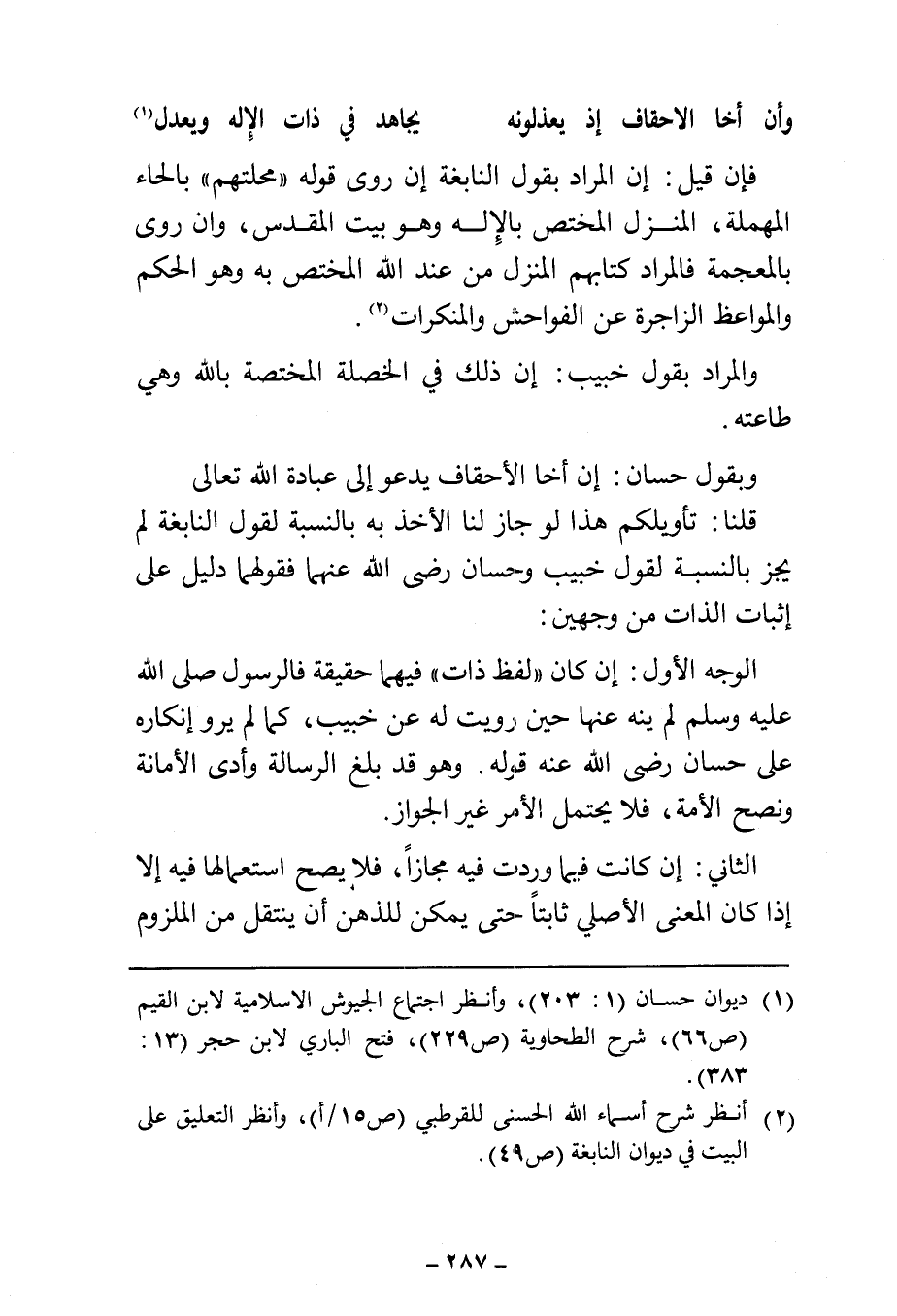 قلنا: تأويلكم هذا لو جاز لنا الأخذ به بالنسبة لقول النابغة لم يجز بالنسبة لقول خبيب وحسان رضي الله عنهما فقولهما دليل على إثبات الذات من وجهين: