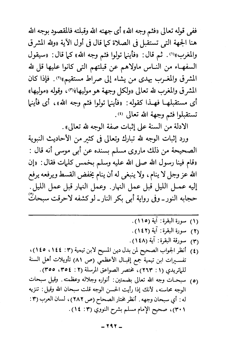 ففي قوله تعالى {فَثَمَّ وَجْهُ اللَّهِ} أي جهته الله وقبلته فالمقصود بوجه الله هنا الجهة التي تستقبل في الصلاة كما قال في أول الآية {وَلِلَّهِ الْمَشْرِقُ وَالْمَغْرِبُ} (¬١). ثم قال: {فَأَيْنَمَا تُوَلُّوا فَثَمَّ وَجْهُ اللَّهِ} كما قال: {سَيَقُولُ السُّفَهَاءُ مِنَ النَّاسِ مَا وَلَّاهُمْ عَنْ قِبْلَتِهِمُ الَّتِي كَانُوا عَلَيْهَا قُلْ لِلَّهِ الْمَشْرِقُ وَالْمَغْرِبُ يَهْدِي مَنْ يَشَاءُ إِلَى صِرَاطٍ مُسْتَقِيمٍ} (¬٢). فإذا كان المشرق والمغرب لله تعالى {وَلِكُلٍّ وِجْهَةٌ هُوَ مُوَلِّيهَا} (¬٣)، وقوله "موليها" أي مستقبلها فهذا كقوله: {فَأَيْنَمَا تُوَلُّوا فَثَمَّ وَجْهُ اللَّهِ}، أي فأينما تستقبلوا فثم وجهة الله تعالى (¬٤).