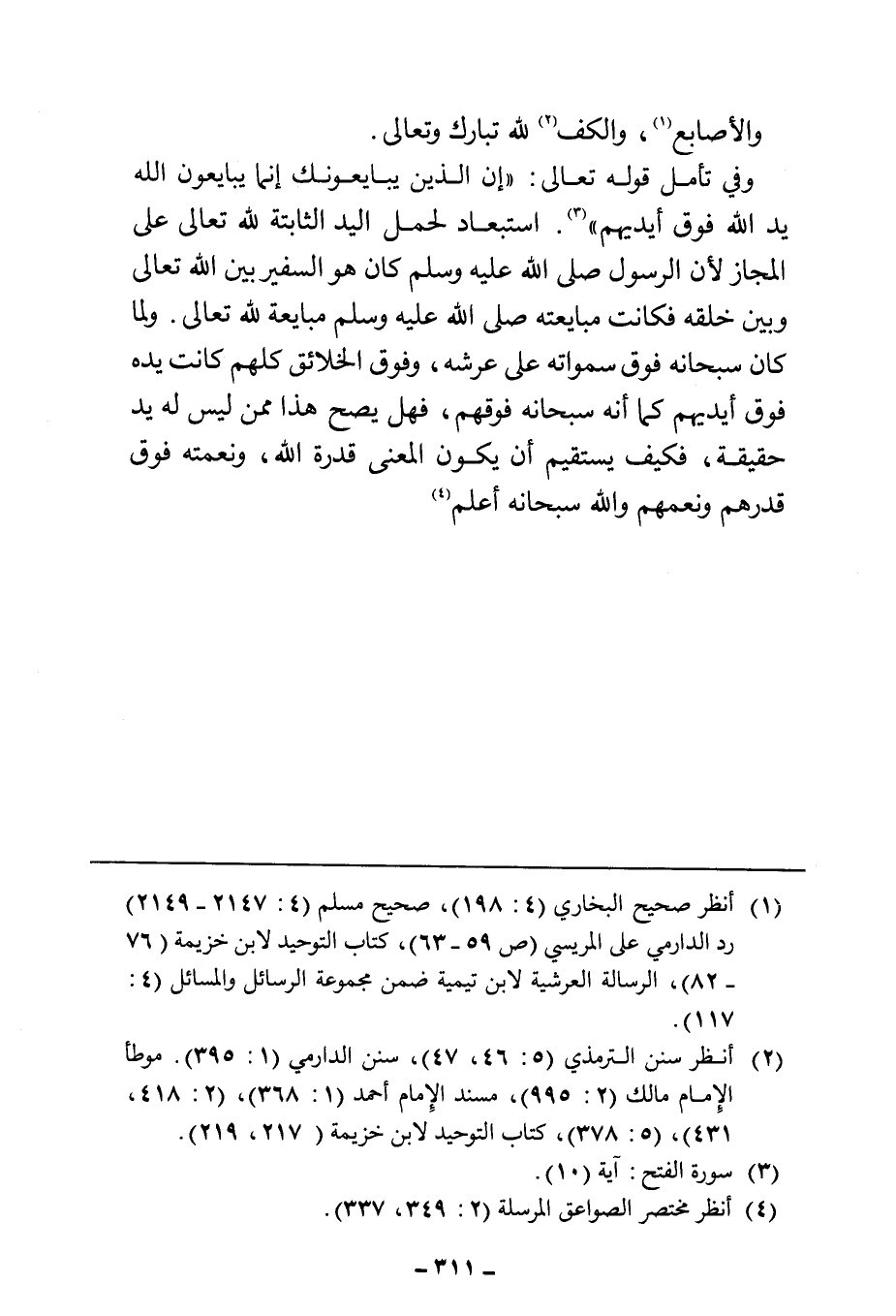 وفي تأمل قوله تعالى: {إِنَّ الَّذِينَ يُبَايِعُونَكَ إِنَّمَا يُبَايِعُونَ اللَّهَ يَدُ اللَّهِ فَوْقَ أَيْدِيهِمْ} (¬٣). استبعاد لحمل اليد الثابتة لله تعالى على المجاز لأن الرسول صلى الله عليه وسلم كان هو السفير بين الله تعالى وبين خلقه فكانت مبايعته صلى الله عليه وسلم مبايعة لله تعالى. ولما كان سبحانه فوق سمواته على عرشه، وفوق الخلائق كلهم كانت يده فوق أيديهم كما أنه سبحانه فوقهم، فهل يصح هذا ممن ليس له يد حقيقة، فكيف يستقيم أن يكون المعنى قدرة الله، ونعمته فوق قدرهم ونعمهم والله سبحانه أعلم (¬٤)