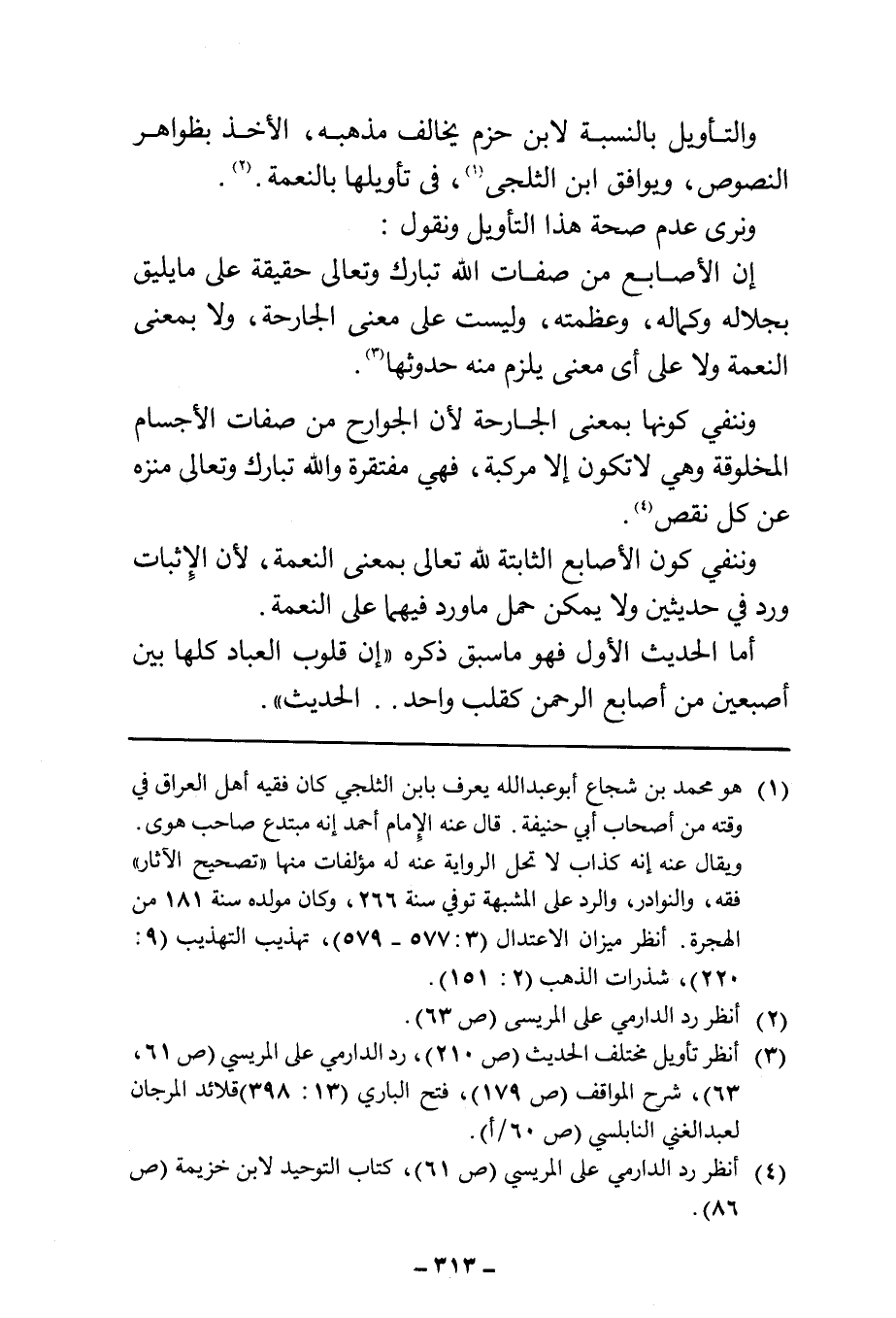 (¬٣) انظر تأويل مختلف الحديث (ص ٢١٠)، رد الدارمي على المريسي (ص ٦١، ٦٣)، شرح المواقف (ص ١٧٩)، فتح الباري (١٣: ٣٩٨) قلائد المرجان لعبد الغني النابلسي (ص ٦٠/ أ).
