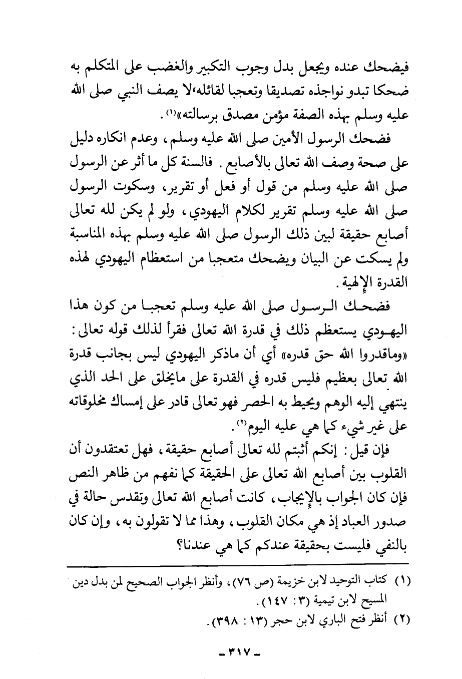 فضحك الرسول الأمين صلى الله عليه وسلم، وعدم إنكاره دليل على صحة وصف الله تعالى بالأصابع. فالسنة كل ما أثر عن الرسول صلى الله عليه وسلم من قول أو فعل أو تقرير، وسكوت الرسول صلى الله عليه وسلم تقرير لكلام اليهودي، ولو لم يكن لله تعالى أصابع حقيقة لبين ذلك الرسول صلى الله عليه وسلم بهذه المناسبة ولم يسكت عن البيان ويضحك متعجبا من استعظام اليهودي لهذه القدرة الإِلهية.
