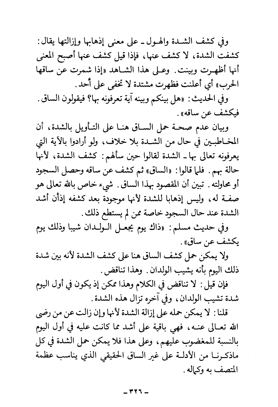 وبيان عدم صحة حمل الساق هنا على التأويل بالشدة، أن المخاطبين في حال من الشدة بلا خلاف، ولو أرادوا بالآية التي يعرفونه تعالى بها - الشدة لقالوا حين سألهم: كشف الشدة، لأنها حالة بهم. فلما قالوا: "الساق" ثم كشف عن ساقه وحصل السجود أو محاولته. تبين أن المقصود بهذا الساق. شيء خاص بالله تعالى هو صفة له، وليس إذهابا للشدة لأنها موجودة بعد كشفه إذ أن أشد الشدة عند حال السجود خاصة ممن لم يستطع ذلك.
