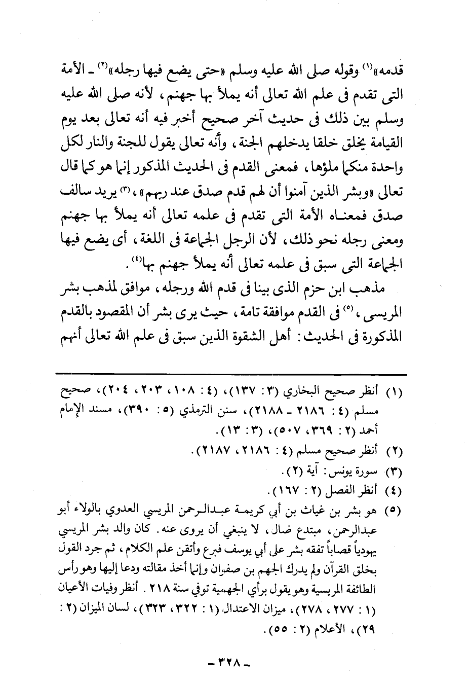 مذهب ابن حزم الذي بينا في قدم الله ورجله، موافق لمذهب بشر المريسى، (¬٥) في القدم موافقة تامة، حيث يرى بشر أن المقصود بالقدم المذكورة في الحديث: أهل الشقوة الذين سبق في علم الله تعالى أنهم