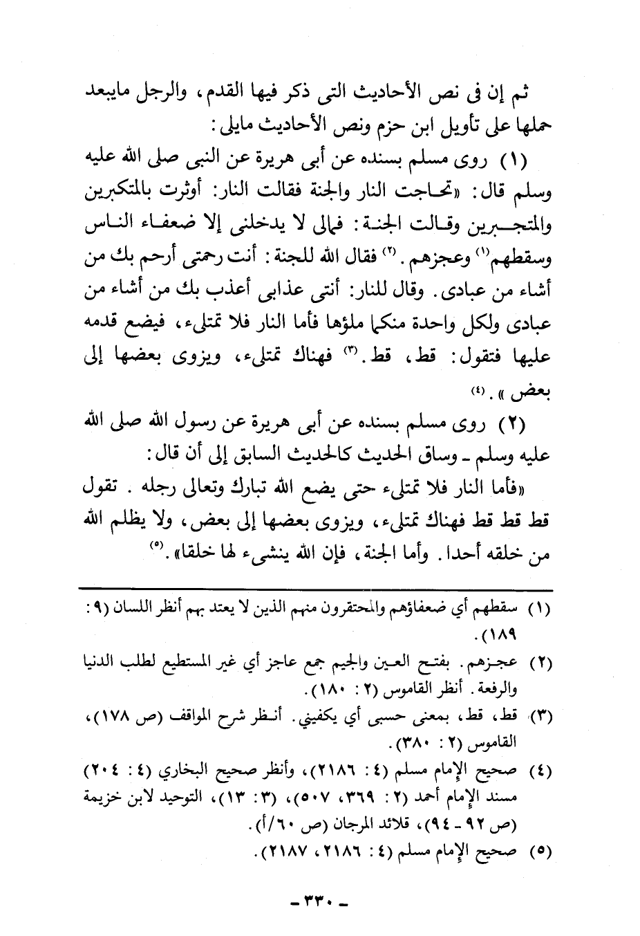 ثم إن في نص الأحاديث التي ذكر فيها القدم، والرجل ما يبعد حملها على تأويل ابن حزم ونص الأحاديث ما يلي: