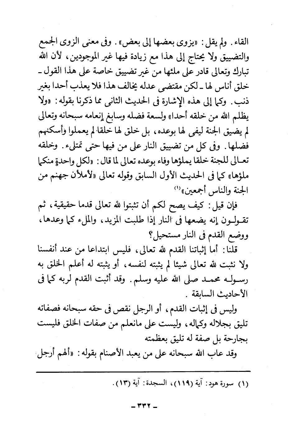 وليس في إثبات القدم، أو الرجل نقص في حقه سبحانه فصفاته تليق بجلاله وكماله، وليست على ما نعلم من صفات الخلق فليست بجارحة بل صفة له تليق بعظمته.