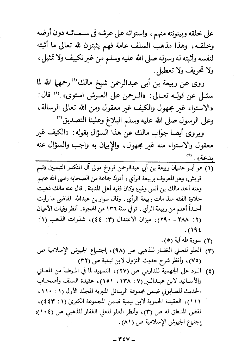 (¬٤) الرد على الجهمية للدارمي ص (٢٧)، التمهيد لما في الموطأ من المعاني والأسانيد لابن عبد البر (٧: ١٣٨، ١٥١)، عقيدة السلف وأصحاب الحديث للصابوني ضمن مجموعة الرسائل المنيرية المجلد الأول (١: ١١٠، ١١١)، العقيدة الحموية لابن تيمية ضمن المجموعة الكبرى (١: ٤٤٣)، نقض المنطق له ص (٣)، وانظر العلو للعلي الغفار للذهبي ص (١٠٤)، اجتماع الجيوش الإِسلامية ص (٨١).