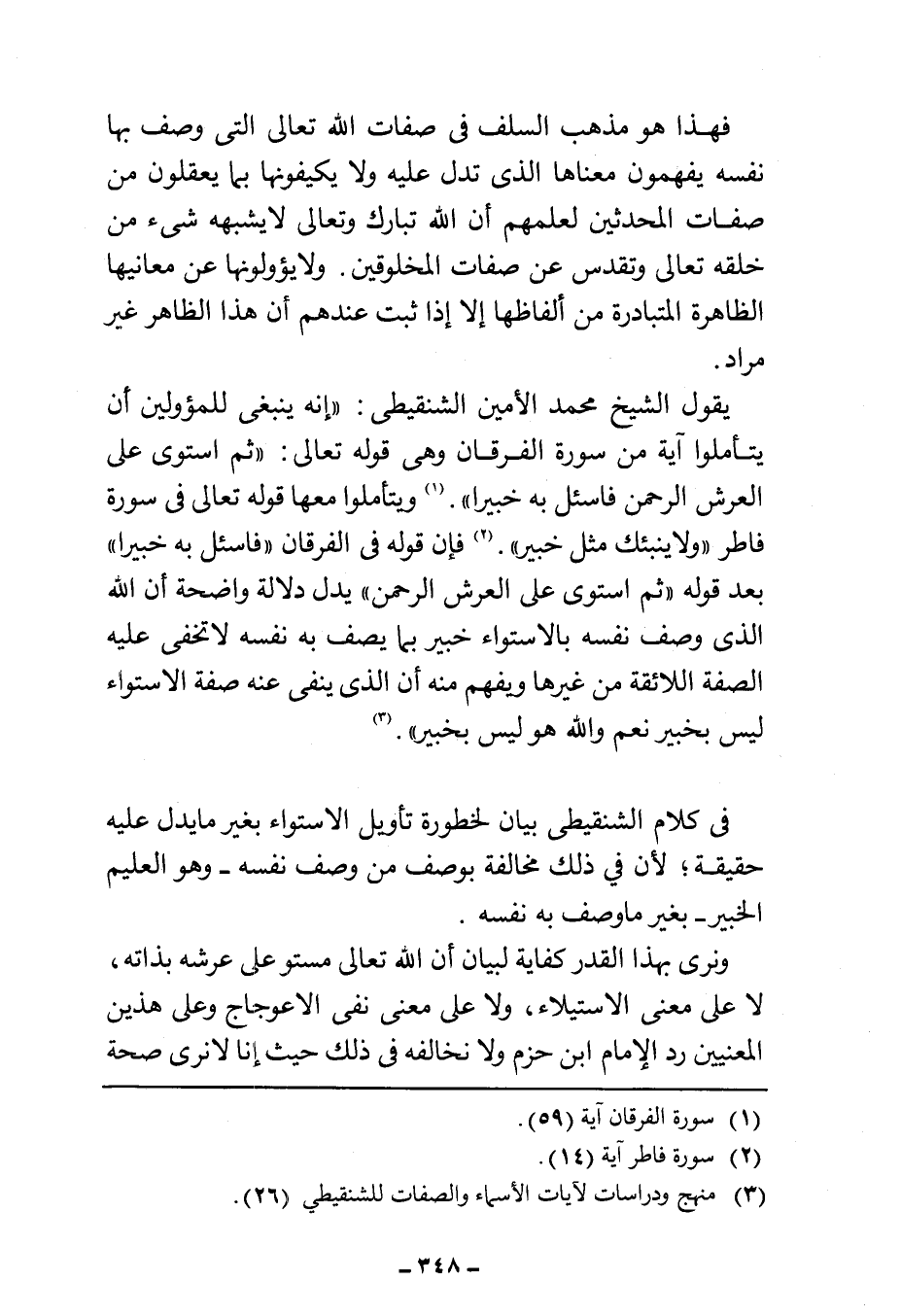 يقول الشيخ محمد الأمين الشنقيطى: "إنه ينبغى للمؤولين أن يتأملوا آية من سورة الفرقان وهي قوله تعالى: {ثُمَّ اسْتَوَى عَلَى الْعَرْشِ الرَّحْمَنُ فَاسْأَلْ بِهِ خَبِيرًا}. (¬١) ويتأملوا معها قوله تعالى في سورة فاطر {وَلَا يُنَبِّئُكَ مِثْلُ خَبِيرٍ}. (¬٢) فإن قوله في الفرقان {فَاسْأَلْ بِهِ خَبِيرًا} بعد قوله {ثُمَّ اسْتَوَى عَلَى الْعَرْشِ الرَّحْمَن} يدل دلالة واضحة أن الله الذي وصف نفسه بالاستواء خبير بما يصف به نفسه لا تخفى عليه الصفة اللائقة من غيرها ويفهم منه أن الذي ينفى عنه صفة الاستواء ليس بخبير نعم والله هو ليس بخبير". (¬٣)
