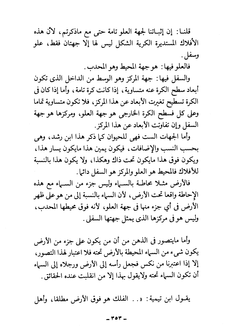 يقول ابن تيمية: " .. الفلك هو فوق الأرض مطلقا، وأهل