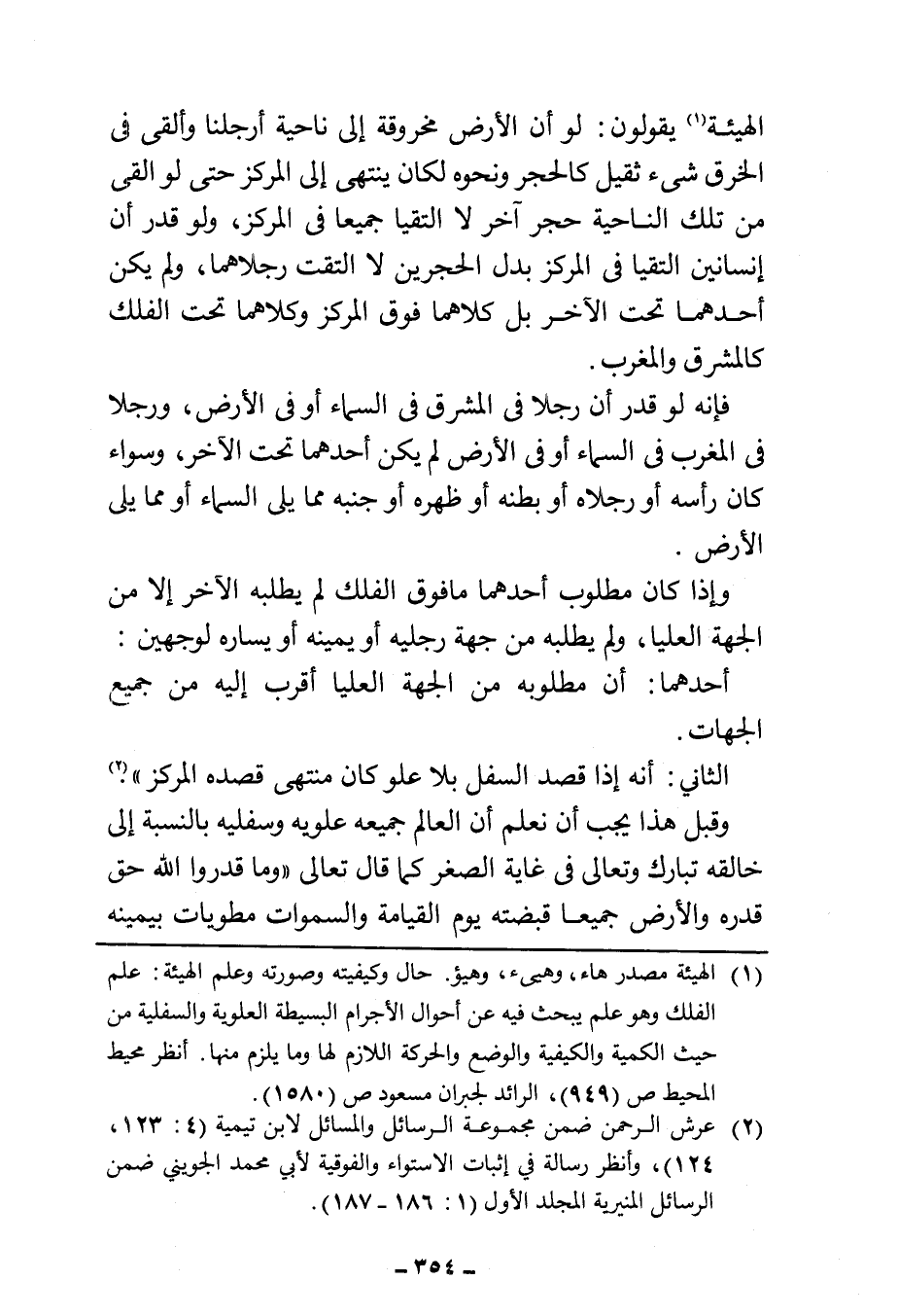 الهيئة (¬١) يقولون: لو أن الأرض مخروقة إلى ناحية أرجلنا وألقى في الخرق شىء ثقيل كالحجر ونحوه لكان ينتهى إلى المركز حتى لو ألقى من تلك الناحية حجر آخر لا التقيا جميعا في المركز، ولو قدر أن إنسانين التقيا في المركز بدل الحجرين لا التقت رجلاهما، ولم يكن أحدهما تحت الآخر بل كلاهما فوق المركز وكلاهما تحت الفلك كالمشرق والمغرب.