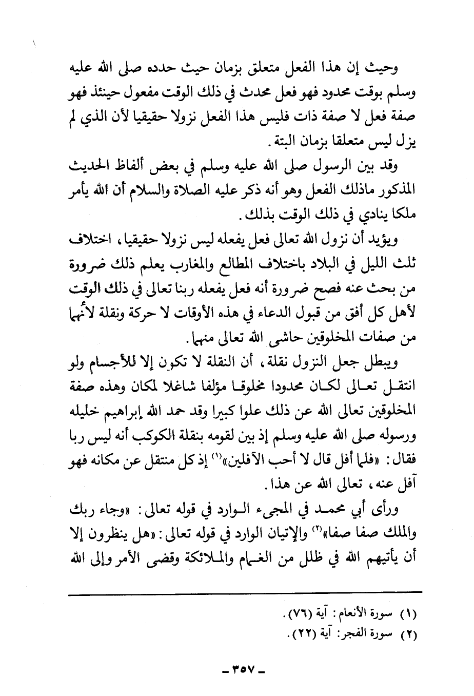 ويبطل جعل النزول نقلة، أن النقلة لا تكون إلا للأجسام ولو انتقل تعالى لكان محدودا مخلوقا مؤلفا شاغلا لمكان وهذه صفة المخلوقين تعالى الله عن ذلك علوا كبيرا وقد حمد الله إبراهيم خليله ورسوله صلى الله عليه وسلم إذ بين لقومه بنقلة الكوكب أنه ليس ربا فقال: "فلما أفل قال لا أحب الآفلين" (¬١) إذ كل منتقل عن مكانه فهو آفل عنه، تعالى الله عن هذا.