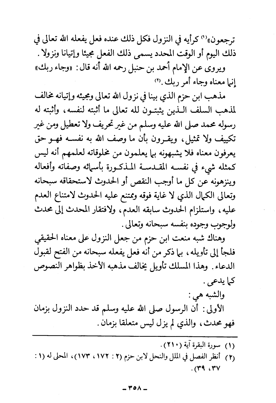 مذهب ابن حزم الذي بينا في نزول الله تعالى ومجيئه وإتيانه مخالف لمذهب السلف الذين يثبتون لله تعالى ما أثبته لنفسه، وأثبته له رسوله محمد صلى الله عليه وسلم من غير تحريف ولا تعطيل ومن غير تكييف ولا تمثيل، ويقرون بأن ما وصف الله به نفسه فهو حق يعرفون معناه فلا يشبهونه بما يعلمون من مخلوقاته لعلمهم أنه ليس كمثله شيء في نفسه المقدسة المذكورة بأسمائه وصفاته وأفعاله وينزهونه عن كل ما أوجب النقص أو الحدوث لاستحقاقه سبحانه وتعالى الكمال الذي لا غاية فوقه وممتنع عليه الحدوث لامتناع العدم عليه، واستلزام الحدوث سابقه العدم، ولافتقار المحدث إلى محدث ولوجوب وجوده بنفسه سبحانه وتعالى.
