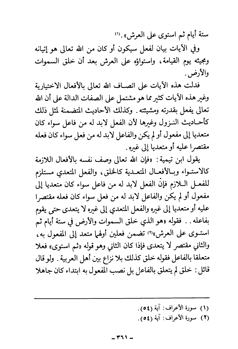 يقول ابن تيمية: "فإن الله تعالى وصف نفسه بالأفعال اللازمة كالاستواء وبالأفعال المتعدية كالخلق، والفعل المتعدي مستلزم للفعل اللازم فإن الفعل لا بد له من فاعل سواء كان متعديا إلى مفعول أو لم يكن والفاعل لا بد له من فعل سواء كان فعله مقتصرا عليه أو متعديا إلى غيره والفعل المتعدي إلى غيره لا يتعدى حتى يقوم بفاعله .. فقوله {هُوَ الَّذِي خَلَقَ السَّمَاوَاتِ وَالْأَرْضَ فِي سِتَّةِ أَيَّامٍ ثُمَّ اسْتَوَى عَلَى الْعَرْشِ} (¬٢) تضمن فعلين أولهما متعد إلى المفعول به، والثاني مقتصر لا يتعدى فإذا كان الثاني وهو قوله "ثم استوى" فعلا متعلقا بالفاعل فقوله خلق كذلك بلا نزاع بين أهل العربية. ولو قال قائل: خلق لم يتعلق بالفاعل بل نصب المفعول به ابتداء كان جاهلا
