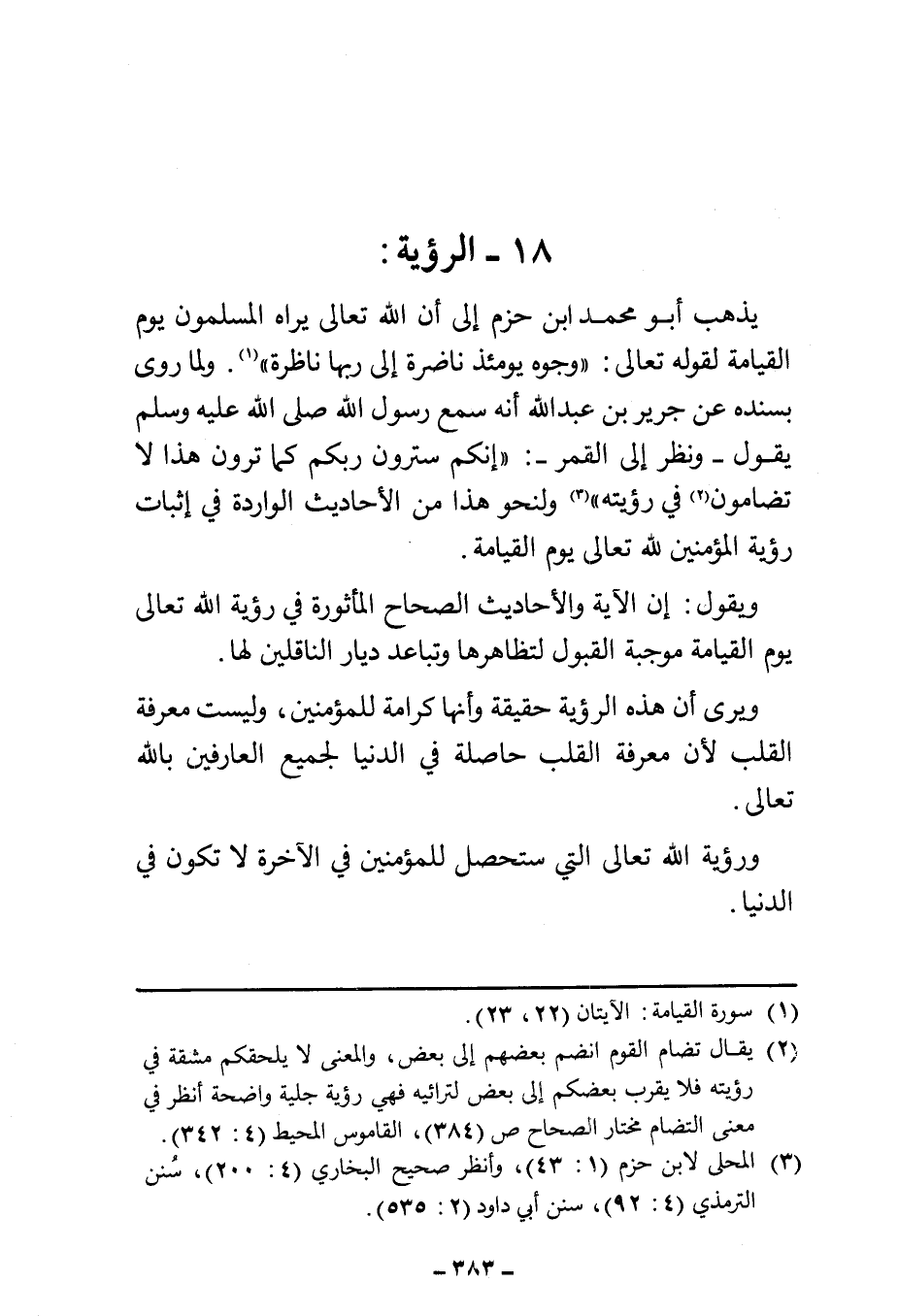 يذهب أبو محمد بن حزم إلى أن الله تعالى يراه المسلمون يوم القيامة لقوله تعالى: {وُجُوهٌ يَوْمَئِذٍ نَاضِرَةٌ (٢٢) إِلَى رَبِّهَا نَاظِرَةٌ} (¬١). ولما روى بسنده عن جرير بن عبد الله أنه سمع رسول الله صلى الله عليه وسلم يقول - ونظر إلى القمر -: "إنكم سترون ربكم كما ترون هذا لا تضامون (¬٢) في رؤيته" (¬٣) ولنحو هذا من الأحاديث الواردة في إثبات رؤية المؤمنين لله تعالى يوم القيامة.
