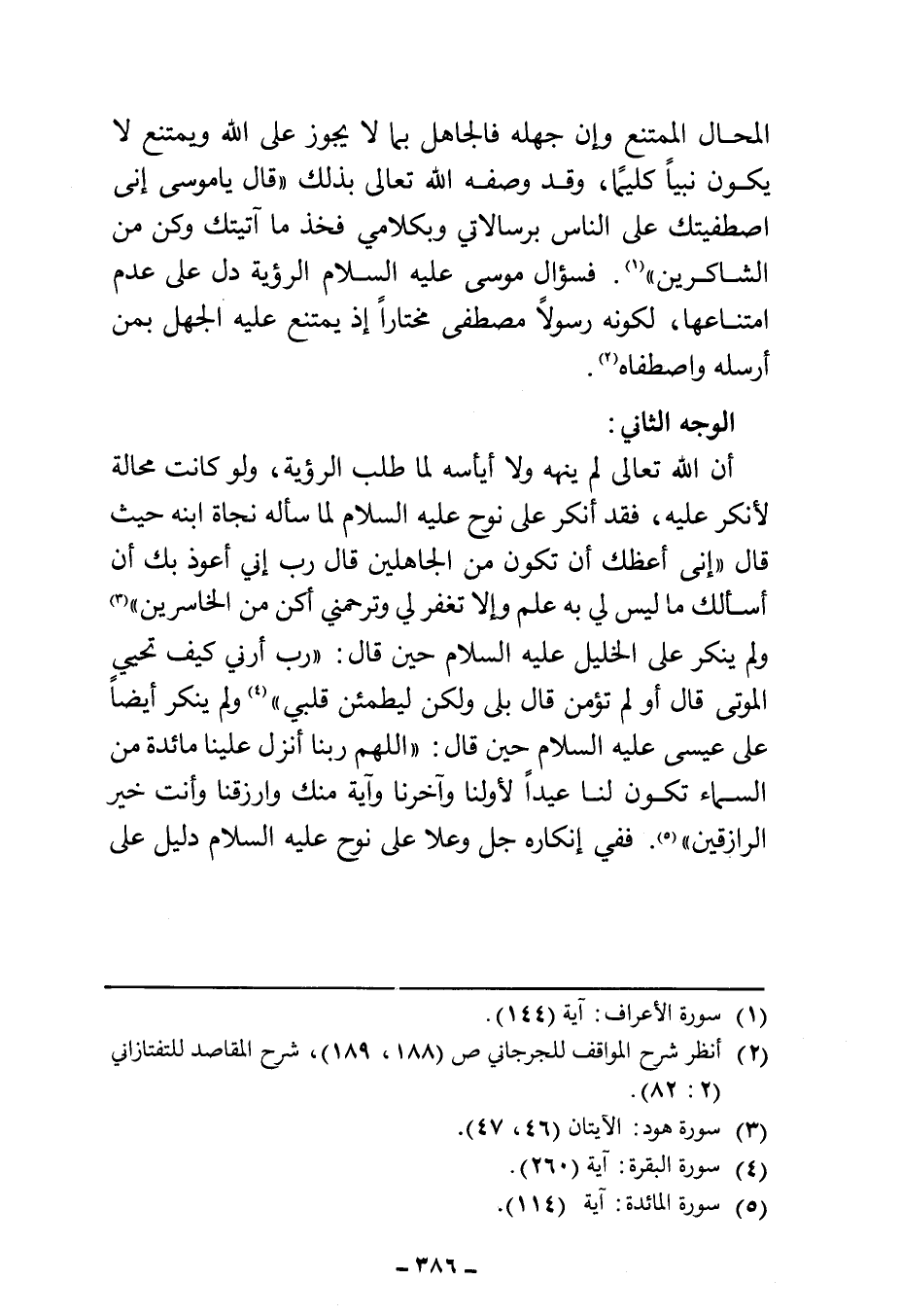 أن الله تعالى لم ينهه ولا أيأسه لما طلب الرؤية، ولو كانت محالة لأنكر عليه، فقد أنكر على نوح عليه السلام لما سأله نجاة ابنه حيث قال {إِنِّي أَعِظُكَ أَنْ تَكُونَ مِنَ الْجَاهِلِينَ (٤٦) قَالَ رَبِّ إِنِّي أَعُوذُ بِكَ أَنْ أَسْأَلَكَ مَا لَيْسَ لِي بِهِ عِلْمٌ وَإِلَّا تَغْفِرْ لِي وَتَرْحَمْنِي أَكُنْ مِنَ الْخَاسِرِينَ} (¬٣) ولم ينكر على الخليل عليه السلام حين قال: {وَإِذْ قَالَ إِبْرَاهِيمُ رَبِّ أَرِنِي كَيْفَ تُحْيِ الْمَوْتَى قَالَ أَوَلَمْ تُؤْمِنْ قَالَ بَلَى وَلَكِنْ لِيَطْمَئِنَّ قَلْبِي} (¬٤) ولم ينكر أيضًا على عيسى عليه السلام حين قال: {قَالَ عِيسَى ابْنُ مَرْيَمَ اللَّهُمَّ رَبَّنَا أَنْزِلْ عَلَيْنَا مَائِدَةً مِنَ السَّمَاءِ تَكُونُ لَنَا عِيدًا لِأَوَّلِنَا وَآخِرِنَا وَآيَةً مِنْكَ وَارْزُقْنَا وَأَنْتَ خَيْرُ الرَّازِقِينَ} (¬٥). ففي إنكاره جل وعلا على نوح عليه السلام دليل على