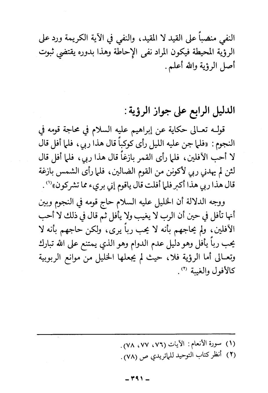 ووجه الدلالة أن الخليل عليه السلام حاج قومه في النجوم وبين أنها تأفل في حين أن الرب لا يغيب ولا يأفل ثم قال في ذلك لا أحب الآفلين، ولم يحاجهم بأنه لا يحب ربًا يرى، ولكن حاجهم بأنه لا يحب ربًا يأفل وهو دليل عدم الدوام وهو الذي يمتنع على الله تبارك وتعالى أما الرؤية فلا، حيث لم يجعلها الخليل من موانع الربوبية كالأفول والغيبة (¬٢).