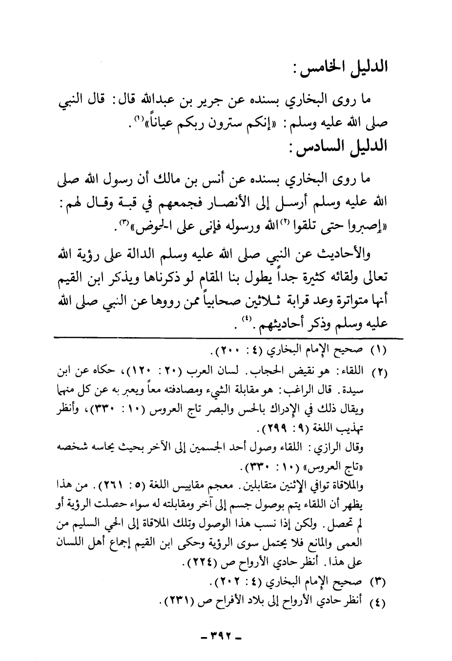 والأحاديث عن النبي صلى الله عليه وسلم الدالة على رؤية الله تعالى ولقائه كثيرة جدًّا يطول بنا المقام لو ذكرناها ويذكر ابن القيم أنها متواترة وعد قرابة ثلاثين صحابيًّا ممن رووها عن النبي صلى الله عليه وسلم وذكر أحاديثهم. (¬٤).