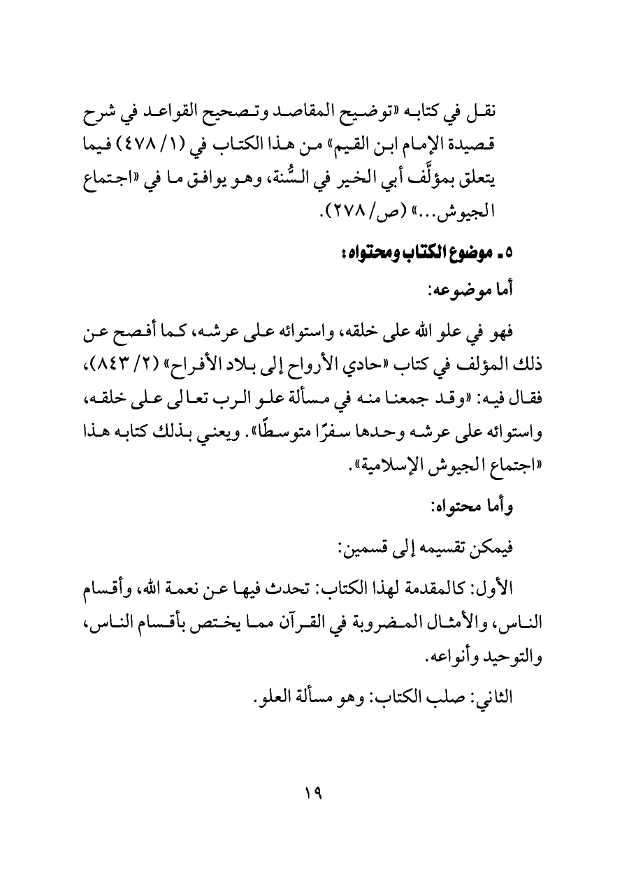 فهو في علو الله على خلقه، واستوائه على عرشه، كما أفصح عن ذلك المؤلف في كتاب «حادي الأرواح إلى بلاد الأفراح» (٢/ ٨٤٣)، فقال فيه: «وقد جمعنا منه في مسألة علو الرب تعالى على خلقه، واستوائه على عرشه وحدها سفرًا متوسطًا». ويعني بذلك كتابه هذا «اجتماع الجيوش الإسلامية».
