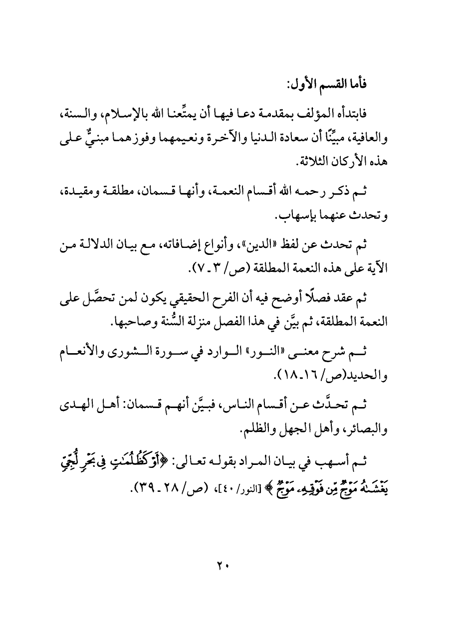ثم شرح معنى «النور» الوارد في سورة الشورى والأنعام والحديد (ص/١٦ ـ ١٨).