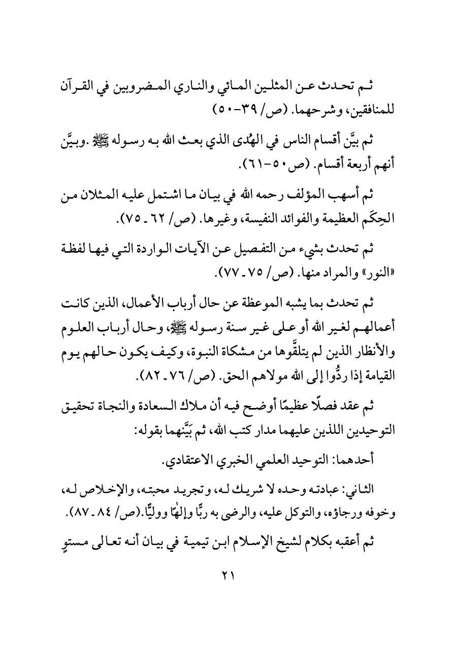 ثم أسهب المؤلف رحمه الله في بيان ما اشتمل عليه المثلان من الحِكَم العظيمة والفوائد النفيسة، وغيرها. (ص/٦٢ ـ ٧٥).