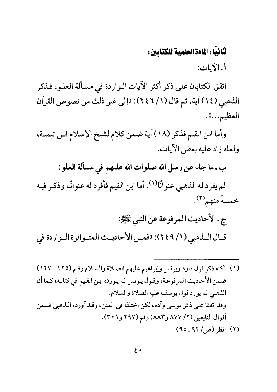 اتفق الكتابان على ذكر أكثر الآيات الواردة في مسألة العلو، فذكر الذهبي (١٤) آية، ثم قال (١/ ٢٤٦): «إلى غير ذلك من نصوص القرآن العظيم ... ».