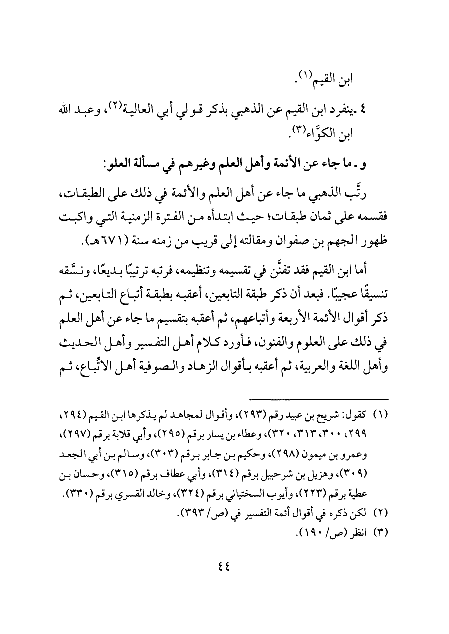 (¬١) كقول: شريح بن عبيد رقم (٢٩٣)، وأقوال لمجاهد لم يذكرها ابن القيم (٢٩٤، ٢٩٩، ٣٠٠، ٣١٣، ٣٢٠)، وعطاء بن يسار برقم (٢٩٥)، وأبي قلابة برقم (٢٩٧)، وعمرو بن ميمون (٢٩٨)، وحكيم بن جابر برقم (٣٠٣)، وسالم بن أبي الجعد (٣٠٩)، وهزيل بن شرحبيل برقم (٣١٤)، وأبي عطاف برقم (٣١٥)، وحسان بن عطية برقم (٢٢٣)، وأيوب السختياني برقم (٣٢٤)، وخالد القسري برقم (٣٣٠).