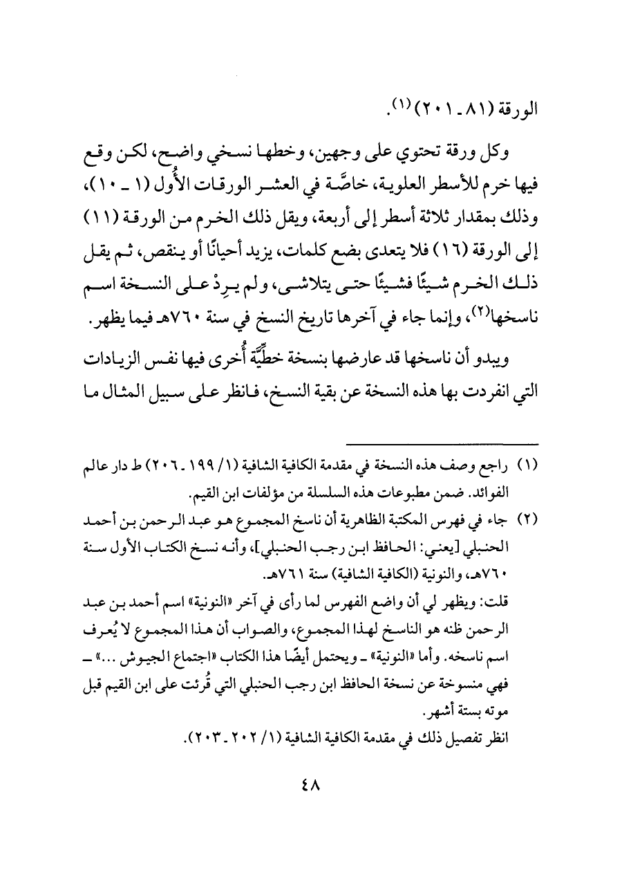 (¬٢) جاء في فهرس المكتبة الظاهرية أن ناسخ المجموع هو عبد الرحمن بن أحمد الحنبلي [يعني: الحافظ ابن رجب الحنبلي]، وأنه نسخ الكتاب الأول سنة ٧٦٠ هـ، والنونية (الكافية الشافية) سنة ٧٦١ هـ.