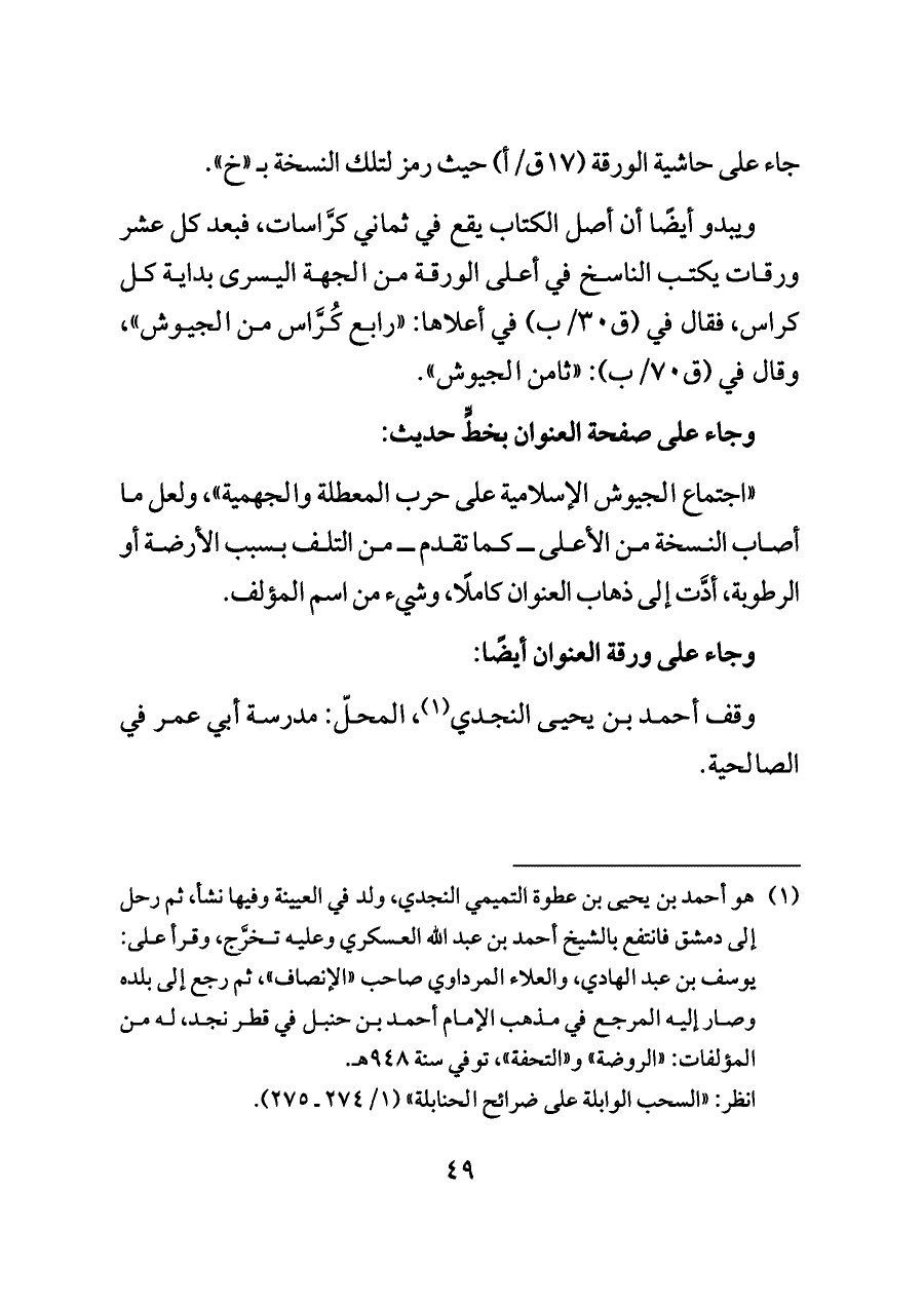 (¬١) هو أحمد بن يحيى بن عطوة التميمي النجدي، ولد في العيينة وفيها نشأ، ثم رحل إلى دمشق فانتفع بالشيخ أحمد بن عبد الله العسكري وعليه تخرَّج، وقرأ على: يوسف بن عبد الهادي، والعلاء المرداوي صاحب «الإنصاف»، ثم رجع إلى بلده وصار إليه المرجع في مذهب الإمام أحمد بن حنبل في قطر نجد، له من المؤلفات: «الروضة» و «التحفة»، توفي سنة ٩٤٨ هـ.