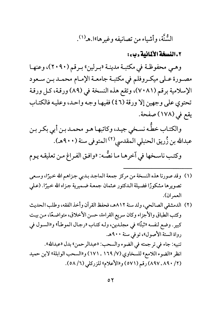 (¬١) وقد صورنا هذه النسخة من مركز جمعة الماجد بدبي جزاهم الله خيرًا، وسعى في تصويرها مشكورًا فضيلة الدكتور عثمان جمعة ضميرية جزاه الله خيرًا. (علي العمران).