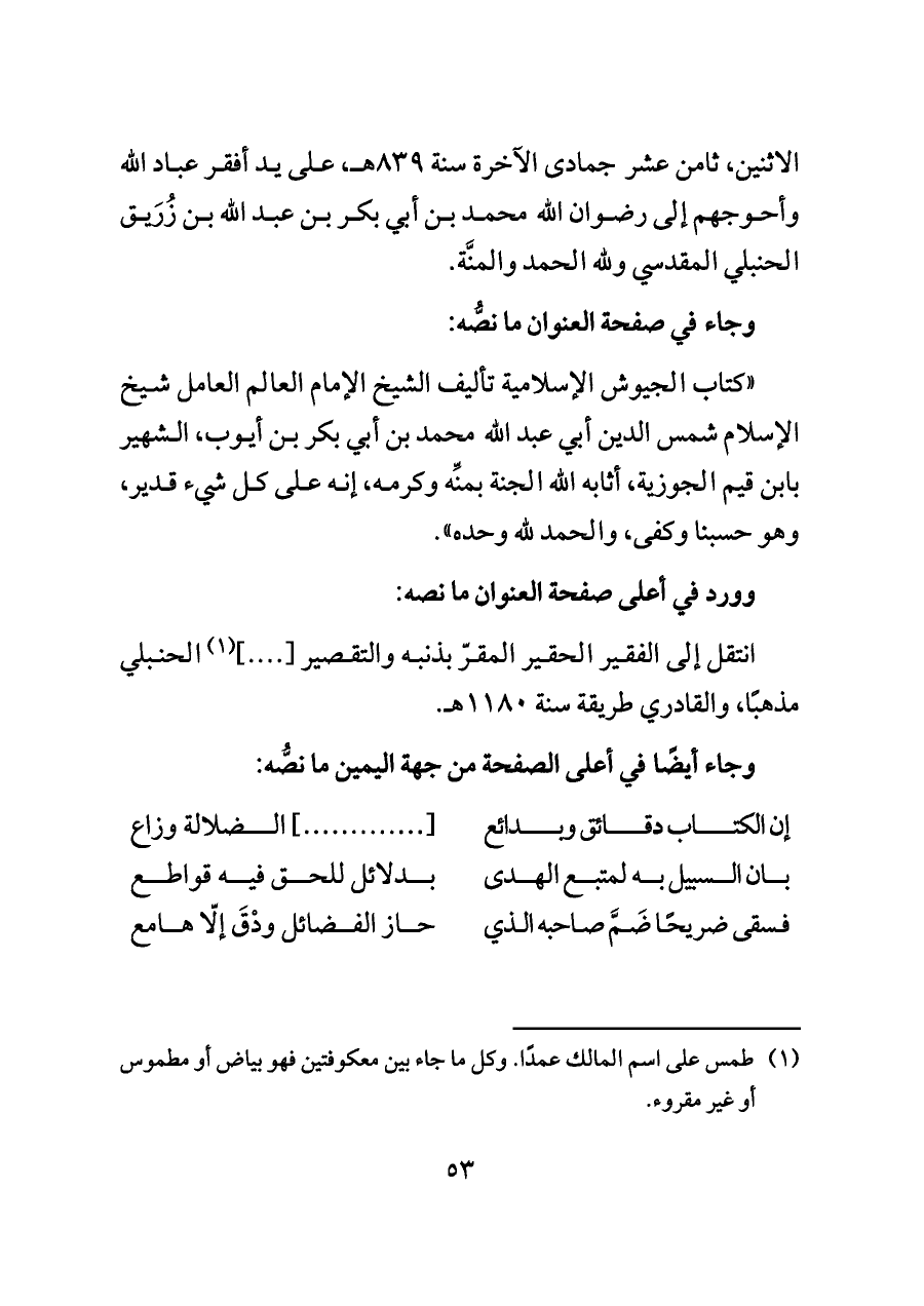 «كتاب الجيوش الإسلامية تأليف الشيخ الإمام العالم العامل شيخ الإسلام شمس الدين أبي عبد الله محمد بن أبي بكر بن أيوب، الشهير بابن قيم الجوزية، أثابه الله الجنة بمنِّه وكرمه، إنه على كل شيء قدير، وهو حسبنا وكفى، والحمد لله وحده».