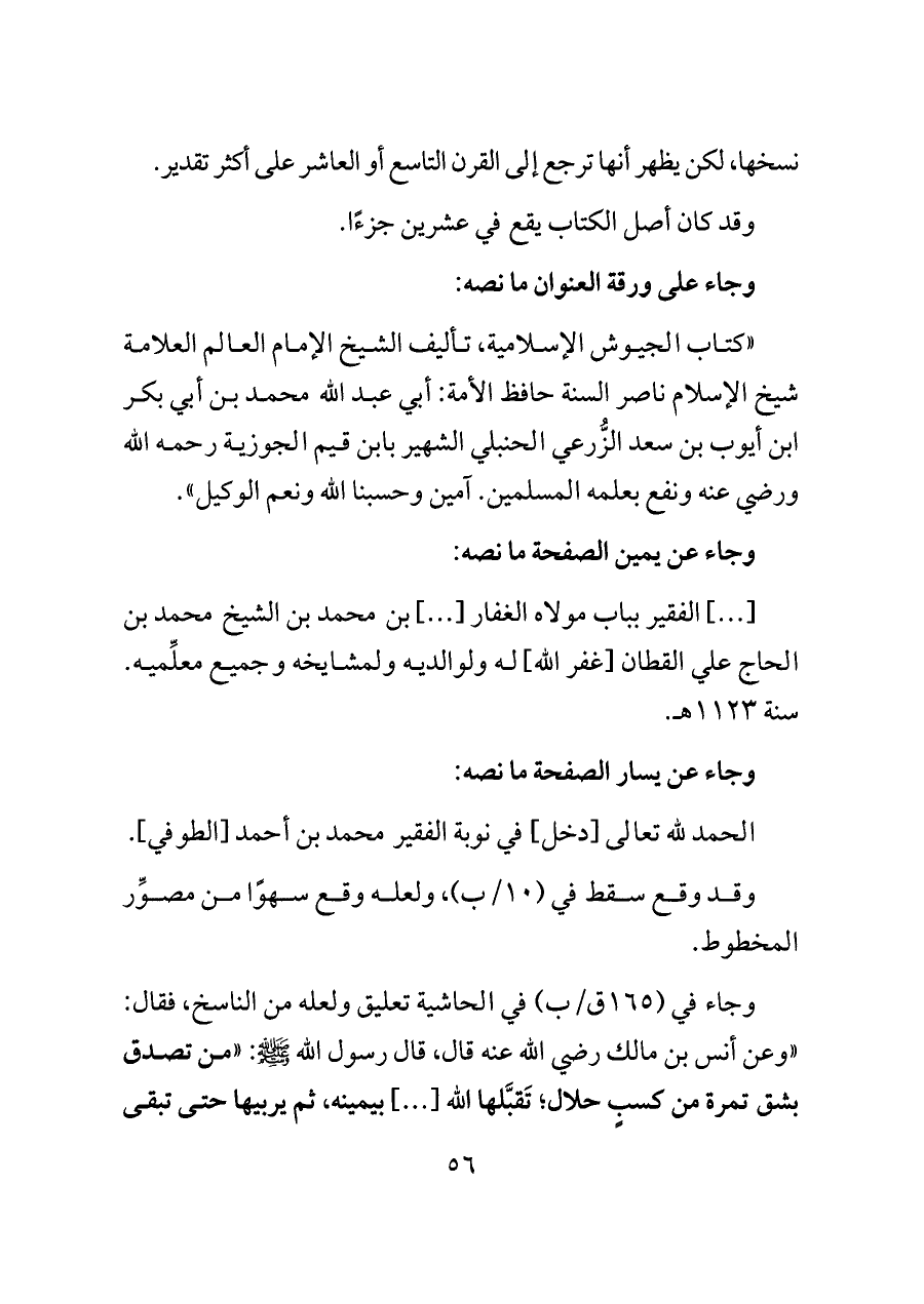«كتاب الجيوش الإسلامية، تأليف الشيخ الإمام العالم العلامة شيخ الإسلام ناصر السنة حافظ الأمة: أبي عبد الله محمد بن أبي بكر ابن أيوب بن سعد الزُّرعي الحنبلي الشهير بابن قيم الجوزية رحمه الله ورضي عنه ونفع بعلمه المسلمين. آمين وحسبنا الله ونعم الوكيل».