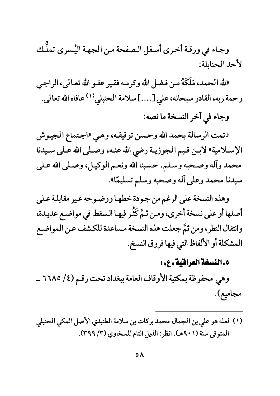 (¬١) لعله هو علي بن الجمال محمد بركات بن سلامة الطنبدي الأصل المكي الحنبلي المتوفى سنة (٩٠١ هـ). انظر: الذيل التام للسخاوي (٣/ ٣٩٩).