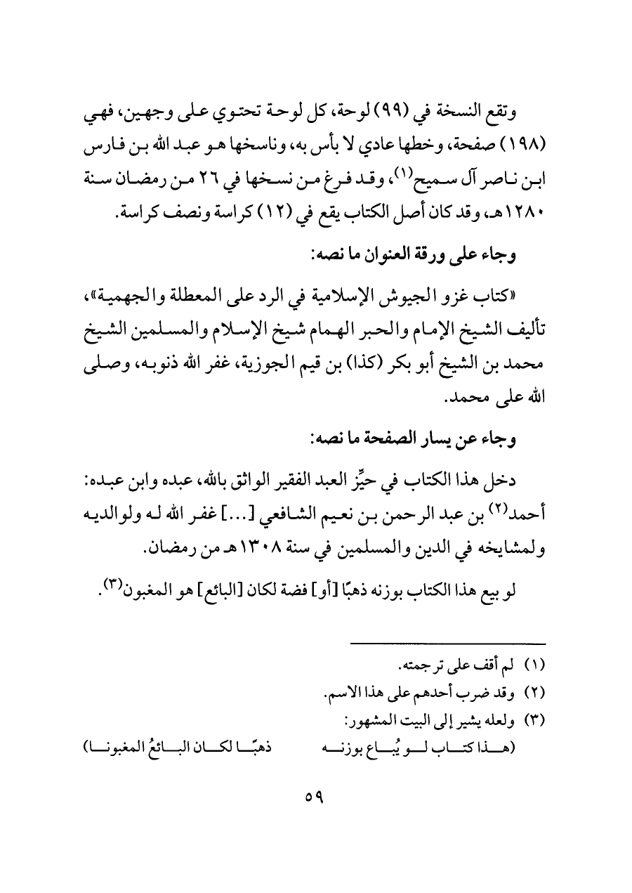 «كتاب غزو الجيوش الإسلامية في الرد على المعطلة والجهمية»، تأليف الشيخ الإمام والحبر الهمام شيخ الإسلام والمسلمين الشيخ محمد بن الشيخ أبو بكر (كذا) بن قيم الجوزية، غفر الله ذنوبه، وصلى الله على محمد.