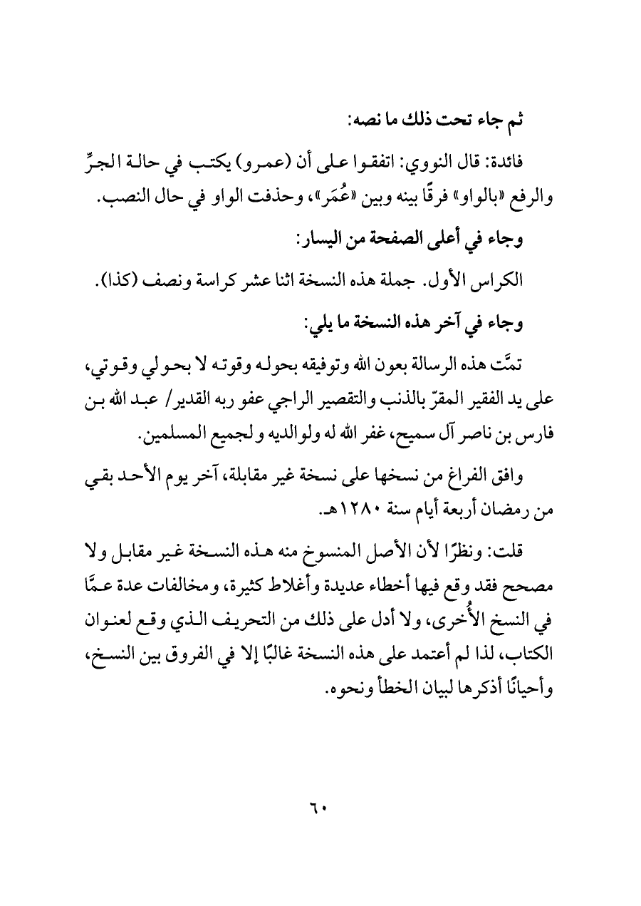 قلت: ونظرًا لأن الأصل المنسوخ منه هذه النسخة غير مقابل ولا مصحح فقد وقع فيها أخطاء عديدة وأغلاط كثيرة، ومخالفات عدة عمَّا في النسخ الأُخرى، ولا أدل على ذلك من التحريف الذي وقع لعنوان الكتاب، لذا لم أعتمد على هذه النسخة غالبًا إلا في الفروق بين النسخ، وأحيانًا أذكرها لبيان الخطأ ونحوه.