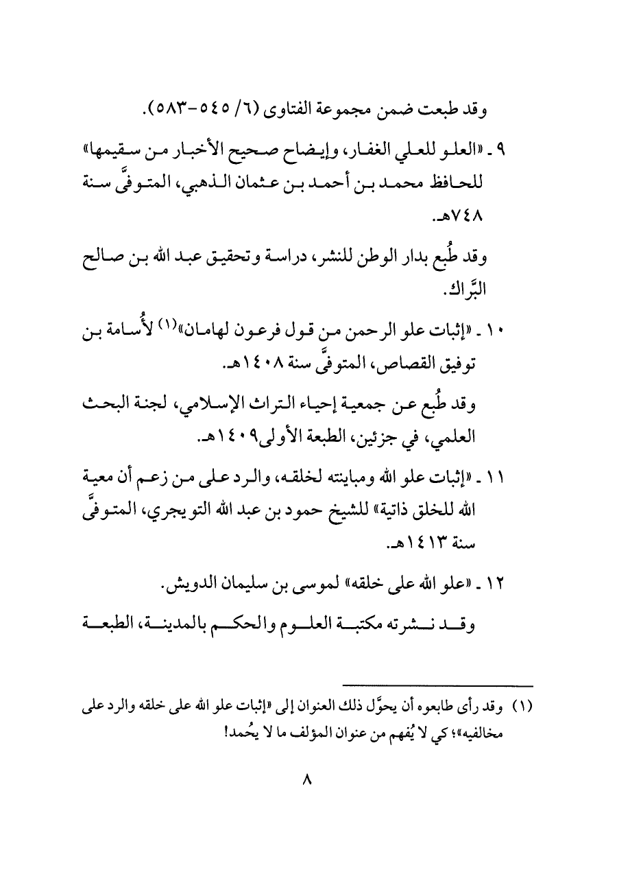 (¬١) وقد رأى طابعوه أن يحوَّل ذلك العنوان إلى «إثبات علو الله على خلقه والرد على مخالفيه»؛ كي لا يُفهم من عنوان المؤلف ما لا يُحمد!
