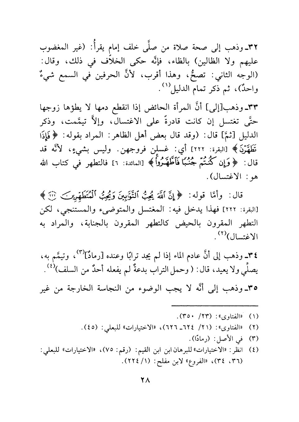 (¬٤) انظر: "الاختيارات" للبرهان ابن ابن القيم: (رقم: ٧٥)، "الاختيارات" للبعلي: (٣٦، ٣٤)، "الفروع" لابن مفلح: (١/ ٢٢٤).