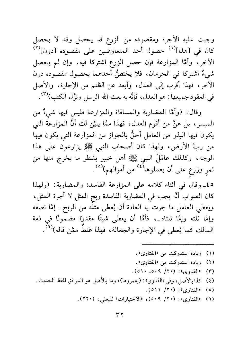 ٤٥ - وقال في أثناء كلامه على المزارعة الفاسدة والمضاربة: (ولهذا كان الصواب أنَّه يجب في المضاربة الفاسدة ربح المثل لا أجرة المثل، ويعطي العامل ما جرت به العادة أن يُعطى مثله من الربح -إمَّا نصفه وإمَّا ثلثه وإمَّا ثلثاه-، فأمَّا أن يعطى شيئًا مقدرًا مضمونًا في ذمة المالك كما يُعطى في الإجارة والجعالة، فهذا غلطٌ ممَّن قاله) (¬٦).