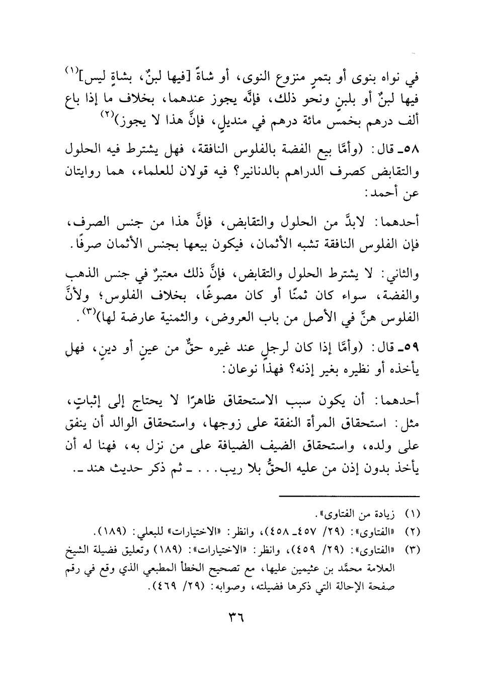 ٥٨ - قال: (وأمَّا بيع الفضة بالفلوس النافقة، فهل يشترط فيه الحلول والتقابض كصرف الدراهم بالدنانير؟ فيه قولان للعلماء، هما روايتان عن أحمد: