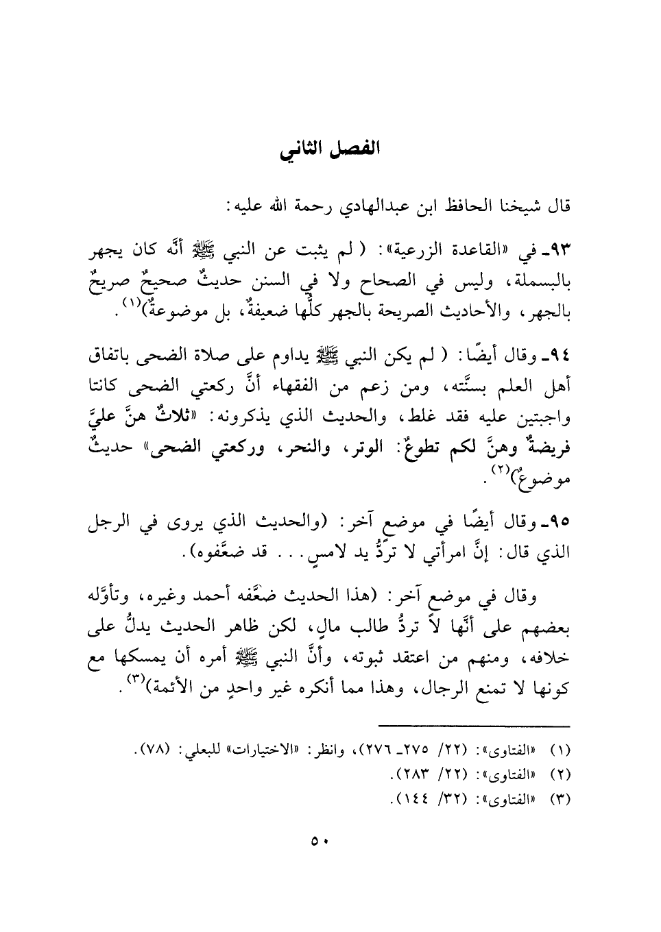 ٩٣ - في "القاعدة الزرعية": (لم يثبت عن النبي - صلى الله عليه وسلم - أنَّه كان يجهر بالبسملة، وليس في الصحاح ولا في السنن حديثٌ صحيحٌ صريحٌ بالجهر، والأحاديث الصريحة بالجهر كلُّها ضعيفة، بل موضوعةٌ) (¬١).