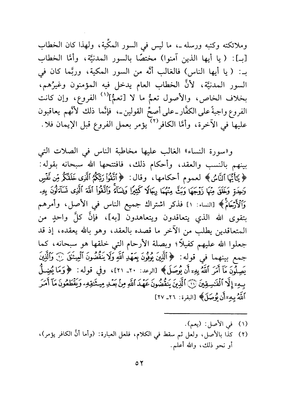 وملائكته وكتبه ورسله-، ما ليس في السور المكِّية، ولهذا كان الخطاب [بـ]: (يا أيها الذين آمنوا) مختصًا بالسور المدنيَّة، وأمَّا الخطاب بـ: (يا أيها الناس) فالغالب أنَّه من السور المكية، وربَّما كان في السور المدنيَّة، لأنَّ الخطاب العام يدخل فيه المؤمنون وغيرُهم، بخلاف الخاص، والأصول تعمُّ ما لا [تعمُّ] (¬١) الفروع، وإن كانت الفروع واجبةً على الكفَّار -على أصحِّ القولين-، فإنَّما ذلك لأنَّهم يعاقبون عليها في الآخرة، وأمَّا الكافر (¬٢) يؤمر بعمل الفروع قبل الإيمان فلا.