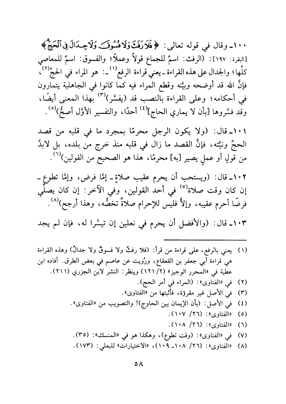 ١٠٠ - وقال في قوله تعالى: {فَلَا رَفَثَ وَلَا فُسُوقَ وَلَا جِدَال فِي الْحَجِّ} [البقرة: ١٩٧]: (الرفث: اسمٌ للجماع قولًا وعملًا؛ والفسوق: اسمٌ للمعاصي كلِّها؛ والجدال على هذه القراءة -يعني قراءة الرفع (¬١) -: هو الراء في الحجِّ (¬٢)، فإنَّ الله قد أوضحه وبيَّنه وقطع المراء فيه كما كانوا في الجاهلية يتمارون في أحكامه؛ وعلى القراءة بالنصب قد (يفسَّر) (¬٣) بهذا المعنى أيضًا، وقد فسَّروها [بأن لا يماري الحاج] (¬٤) أحدًا، والتفسير الأوَّل أصحُّ) (¬٥).
