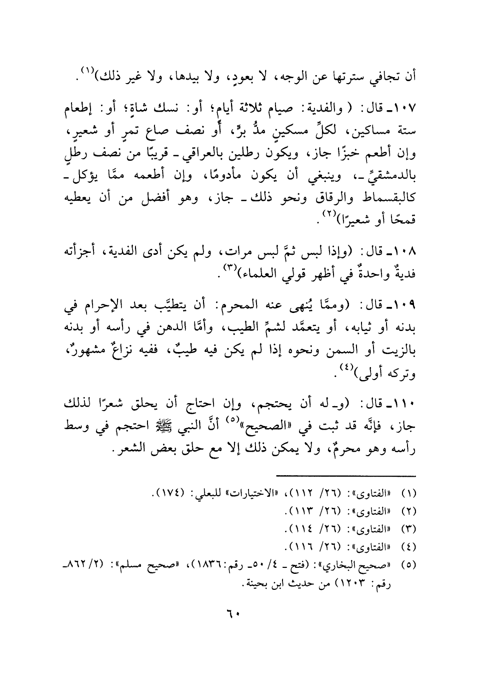 ١٠٧ - قال: (والفدية: صيام ثلاثة أيام؛ أو: نسك شاةٍ؛ أو: إطعام ستة مساكين، لكلِّ مسكينٍ مدُّ برٍّ، أو نصف صاع تمرٍ أو شعيرٍ، وإن أطعم خبزًا جاز، ويكون رطلين بالعراقي -قريبًا من نصف رطلٍ بالدمشقيِّ-، وينبغي أن يكون مأدومًا، وإن أطعمه ممَّا يؤكل -كالبقسماط والرقاق ونحو ذلك- جاز، وهو أفضل من أن يعطيه قمحًا أو شعيرًا) (¬٢).