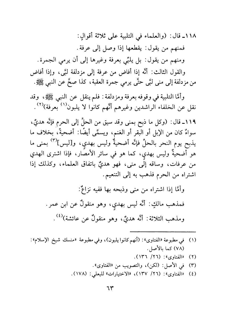 ١١٨ - قال: (والعلماء في التلبية على ثلاثة أقوالٍ: