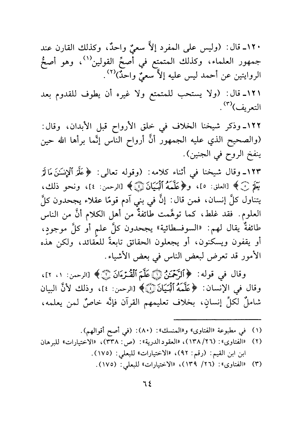 ١٢٣ - وقال شيخنا في أثناء كلامه: (وقوله تعالى: {عَلَّمَ الْإِنْسَانَ مَا لَمْ يَعْلَمْ (٥)} [العلق: ٥]، {عَلَّمَهُ الْبَيَانَ (٤)} [الرحمن: ٤]، ونحو ذلك، يتناول كلَّ إنسان، فمن قال: إنَّ في بني آدم قومًا عقلاء يجحدون كلَّ العلوم. فقد غلط، كما توهَّمت طائفةٌ من أهل الكلام أنَّ من الناس طائفةٌ يقال لهم: "السوفسطائية" يجحدون كلَّ علمٍ أو كلَّ موجودٍ، أو يقفون ويسكنون، أو يجعلون الحقائق تابعةً للعقائد، ولكن هذه الأمور قد تعرض لبعض الناس في بعض الأشياء.