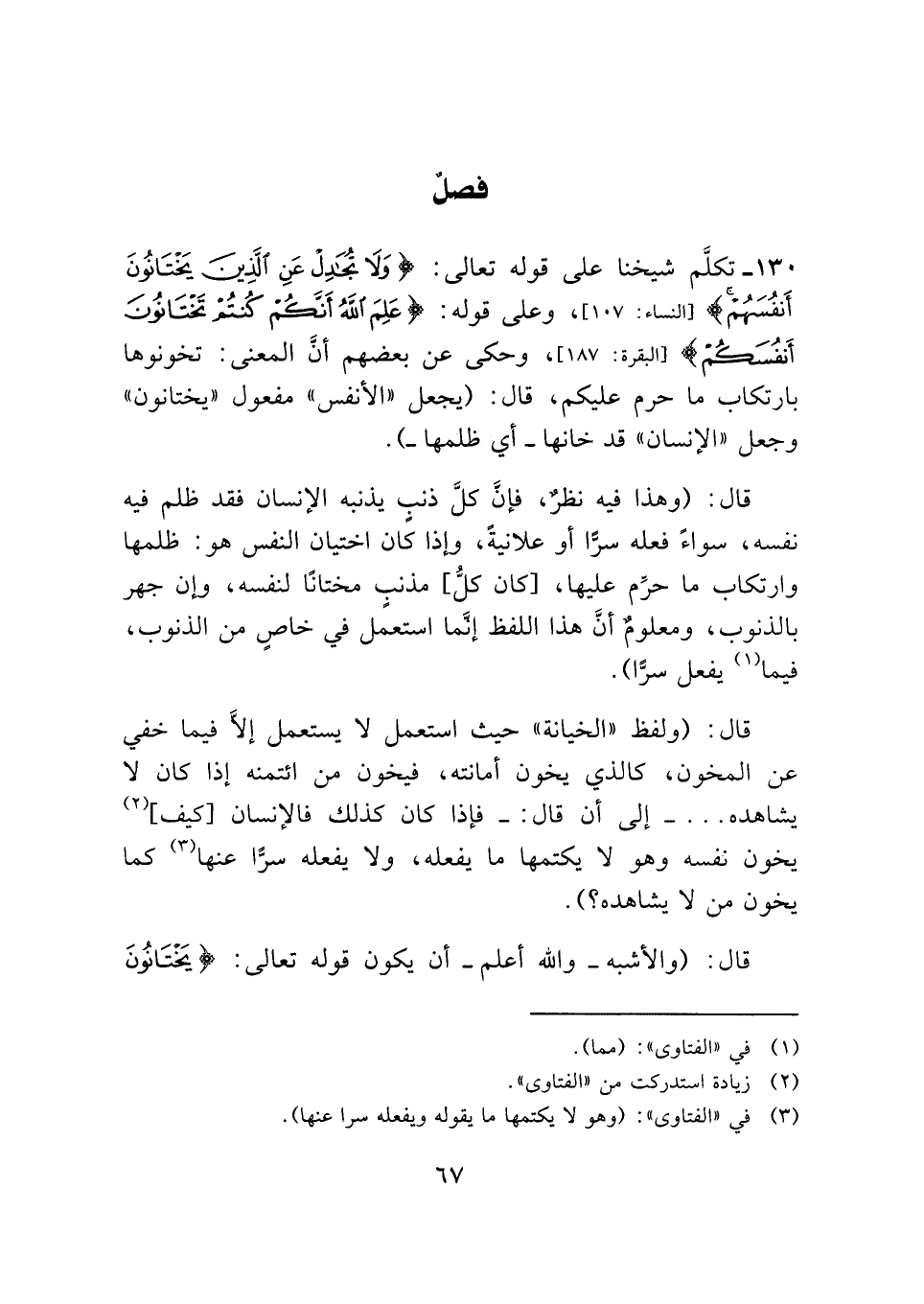 ١٣٠ - تكلَّم شيخنا على قوله تعالى: {وَلَا تُجَادِلْ عَنِ الَّذِينَ يَخْتَانُونَ أَنْفُسَهُمْ} [النساء: ١٠٧]، وعلى قوله: {عَلِمَ اللَّهُ أَنَّكُمْ كُنْتُمْ تَخْتَانُونَ أَنْفُسَكُمْ} [البقرة: ١٨٧] وحكى عن بعضهم أنَّ المعنى: تخونوها بارتكاب ما حرم عليكم، قال: (يجعل "الأنفس" مفعول "يختانون" وجعل "الإنسان" قد خانها -أي ظلمها-).