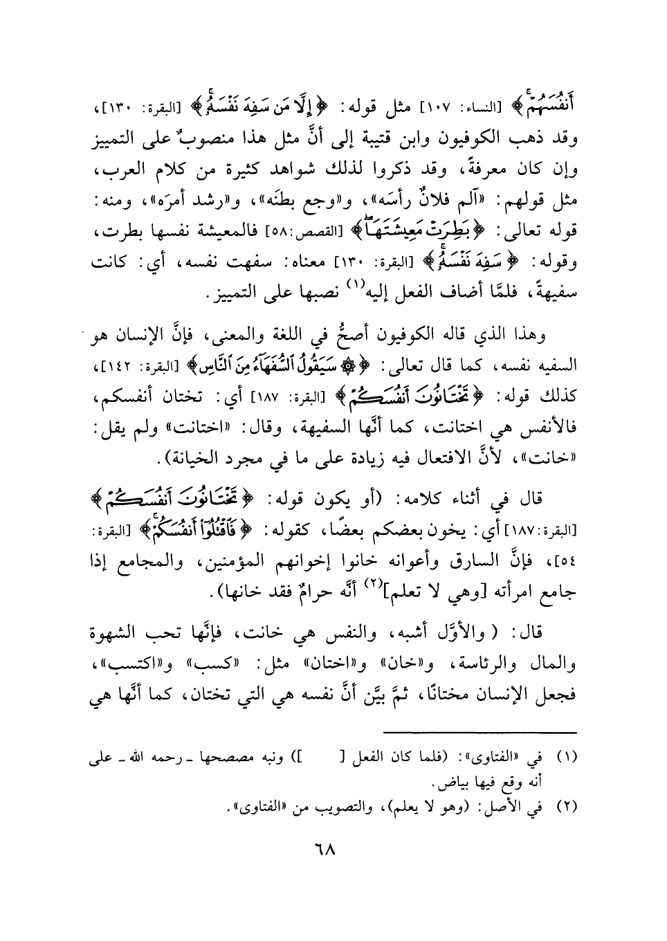 وهذا الذي قاله الكوفيون أصحُّ في اللغة والمعنى، فإن الإنسان هو السفيه نفسه، كما قال تعالى: {سَيَقُولُ السُّفَهَاءُ مِنَ النَّاسِ} [البقرة: ١٤٢]، كذلك قوله: {تَخْتَانُونَ أَنْفُسَكُمْ} [البقرة: ١٨٧] أي: تختان أنفسكم، فالأنفس هي اختانت، كما أنَّها السفيهة، وقال: "اختانت" ولم يقل: "خانت"، لأنَّ الافتعال فيه زيادة على ما في مجرد الخيانة).