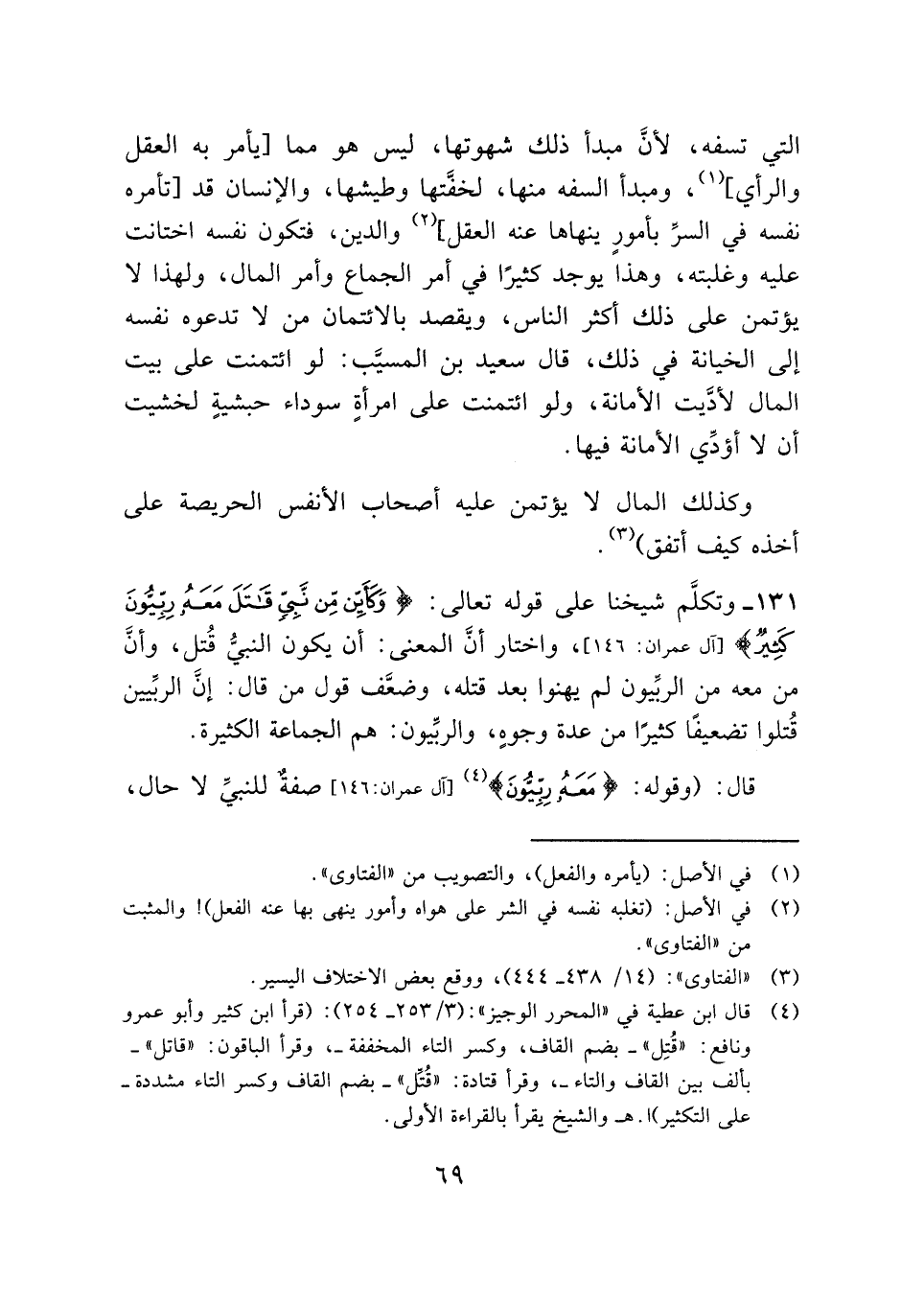 ١٣١ - وتكلَّم شيخنا على قوله تعالى: {وَكَأَيِّنْ مِنْ نَبِيٍّ قَاتَلَ مَعَهُ رِبِّيُّونَ كَثِيرٌ} [آل عمران: ١٤٦]، واختار أنَّ المعنى: أن يكون النبيُّ قُتل، وأنَّ من معه من الربِّيون لم يهنوا بعد قتله، وضعَّف قول من قال: إنَّ الربِّيين قُتلوا تضعيفًا كثيرًا من عدة وجوهٍ، والربِّيون: هم الجماعة الكثيرة.