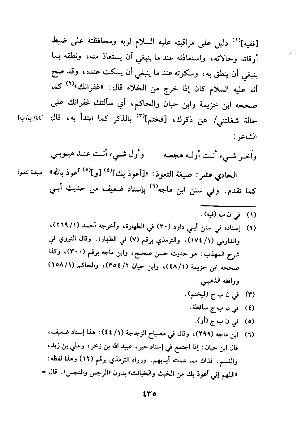 [ففيه] (¬1) دليل على مراقبته عليه السلام لربه ومحافظته على ضبط أوقاته وحالاته، واستعاذته عند ما ينبغي أن يستعاذ منه، ونطقه بما ينبغي أن ينطق به، وسكوته عند ما ينبغي أن يسكت عنده، وقد صح أنه عليه السلام كان إذا خرج من الخلاء قال: "غفرانك" (¬2) كما صححه ابن خزيمة وابن حبان والحاكم، أي سألتك غفرانك على حالة شغلتني عن ذكرك، [فختم] (¬3) بالذكر كما ابتدأ به، قال الشاعر: